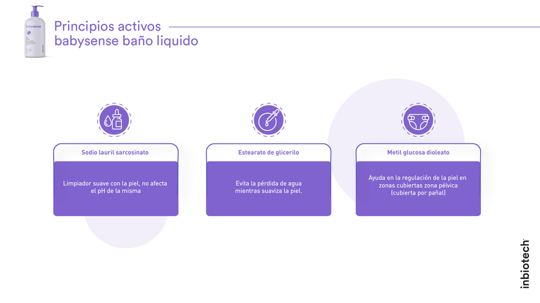 Babysense Baño Líquido limpia suavemente, hidrata profundamente y protege la piel desde el primer uso, preservando su barrera natural y manteniéndola equilibrada y nutrida.