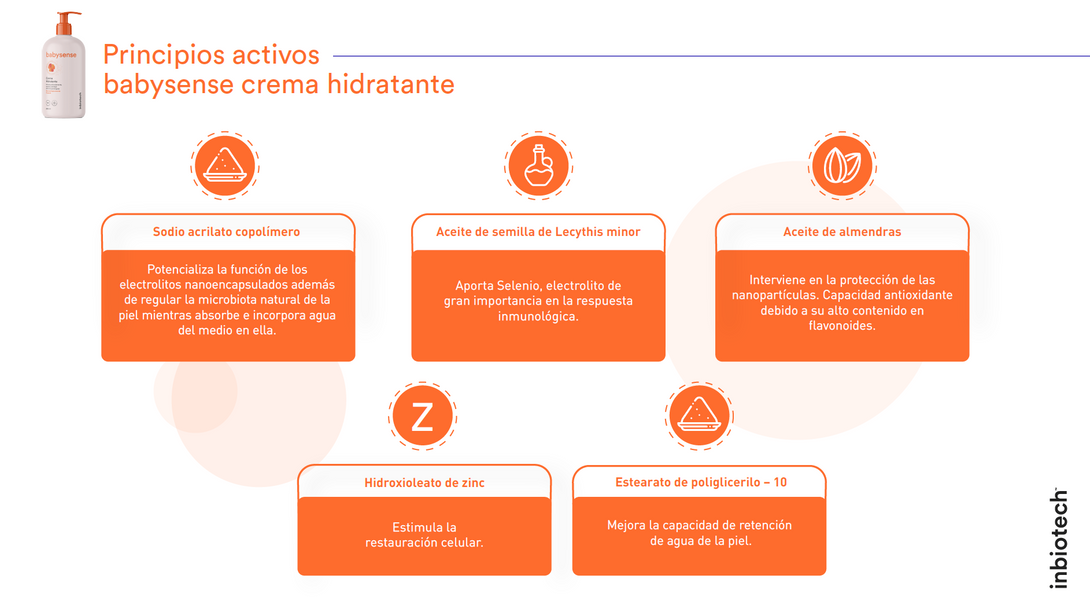 Babysense Crema Hidratante aporta hidratación hasta por 72 horas, atrapando y reteniendo la humedad para una piel suave, protegida y libre de alergias.